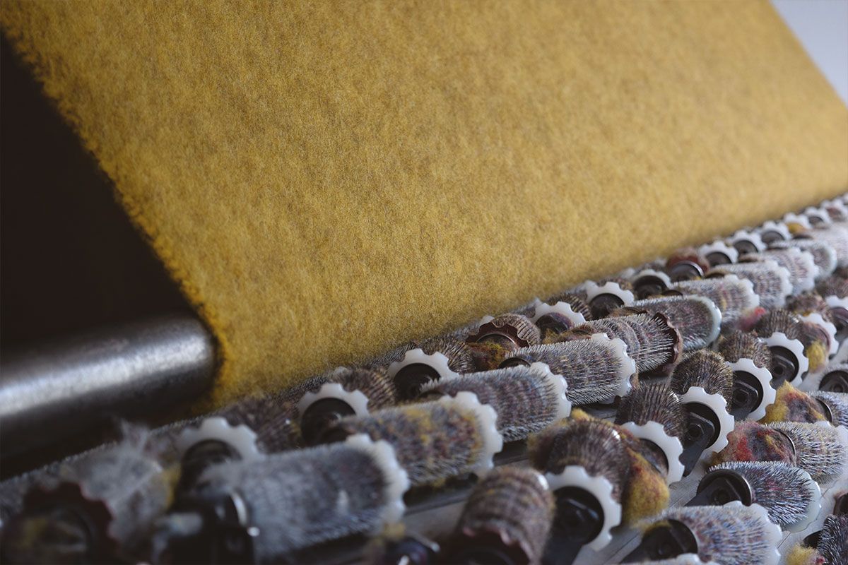 Grâce aux milliards de petites pointes métalliques de la chardonneuse, les fibres de l’étoffe ressortent, ce qui rend le tissu gonflant, léger et très souple.